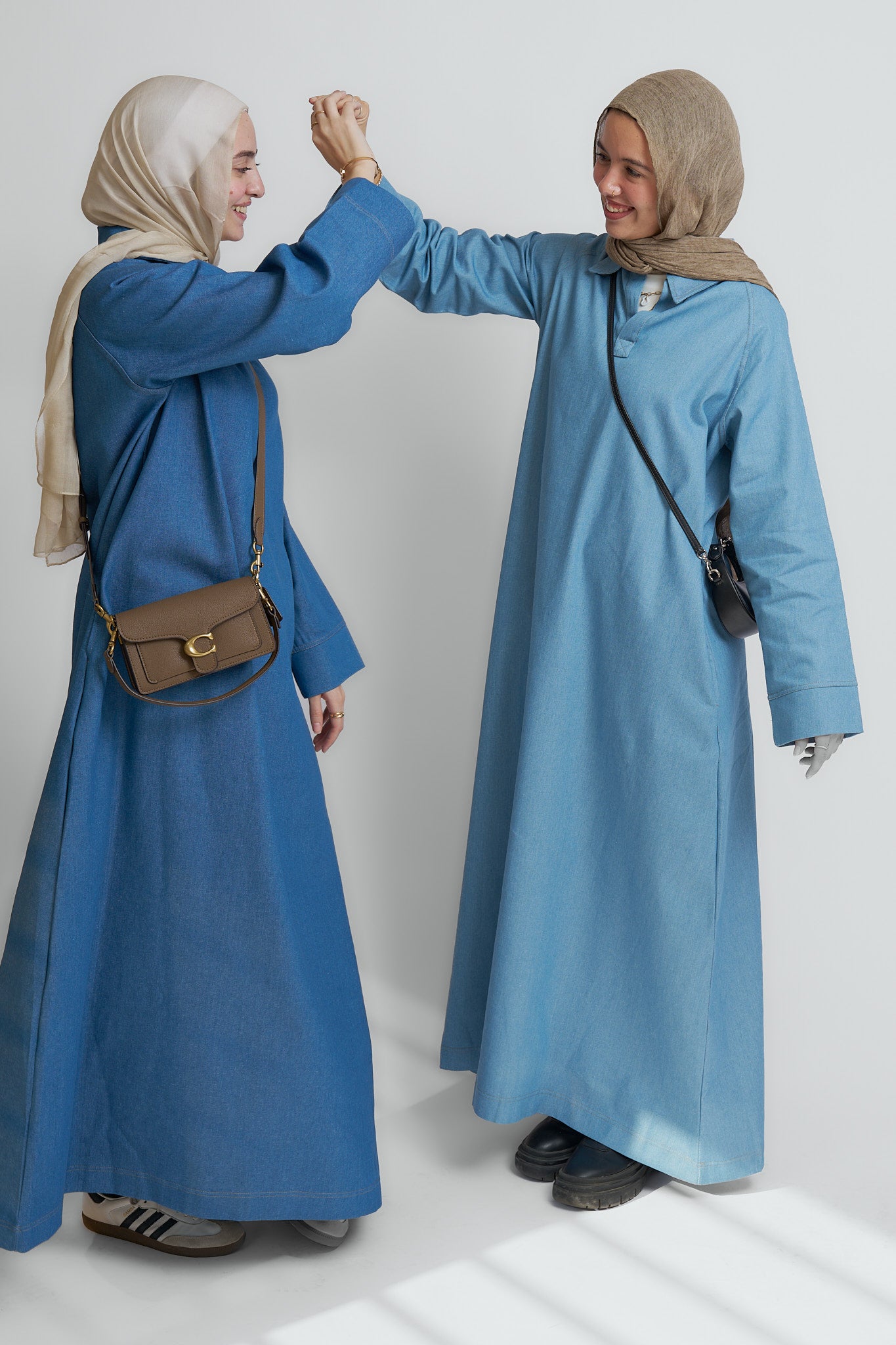 A dark blue denim maxi dress crafted in premium heavy denim, offered in S/M and L/XL (145 cm).