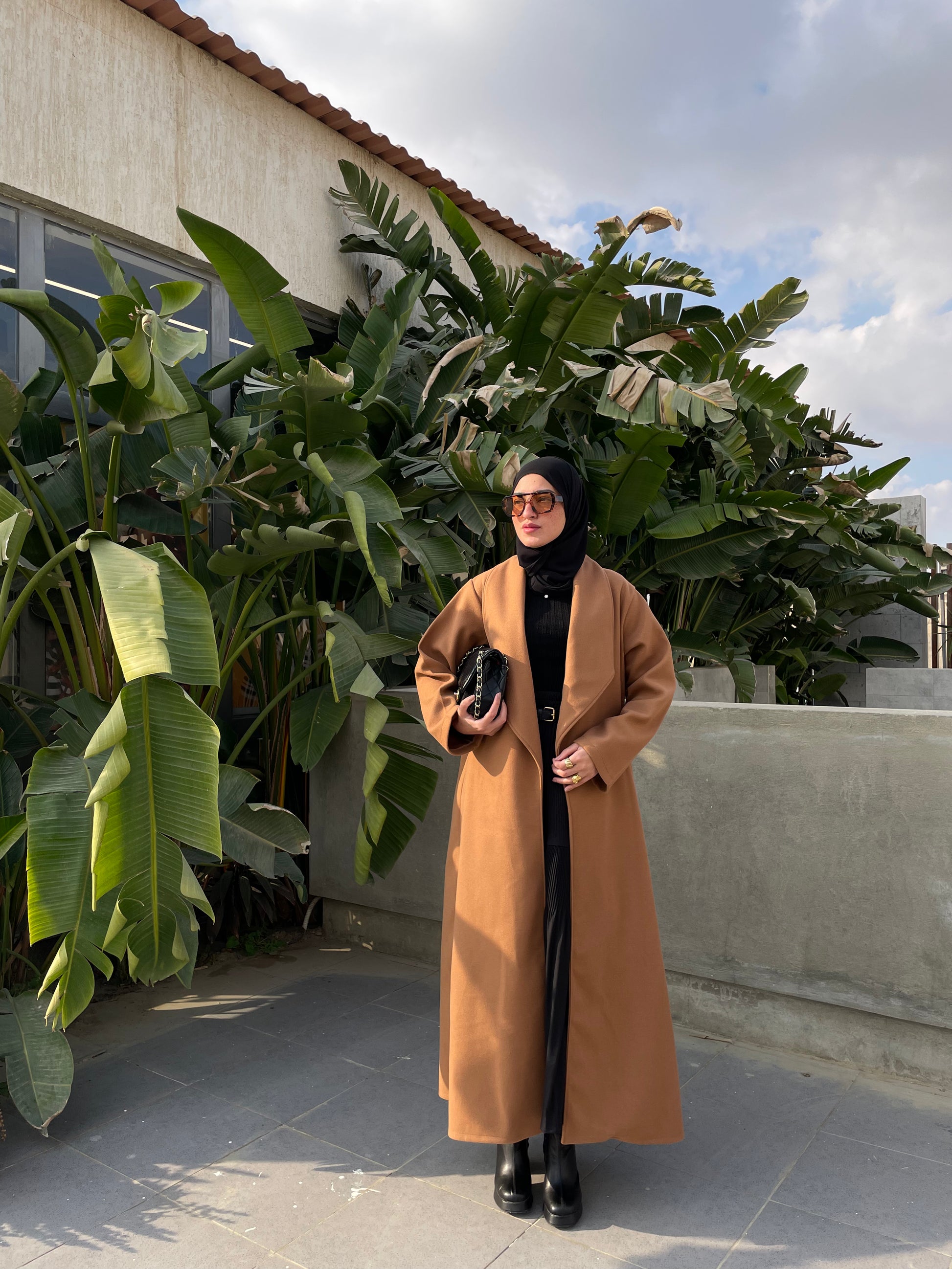 A luxurious long heavy coat in a warm camel shade, crafted from premium wool blend for ultimate comfort and warmth.