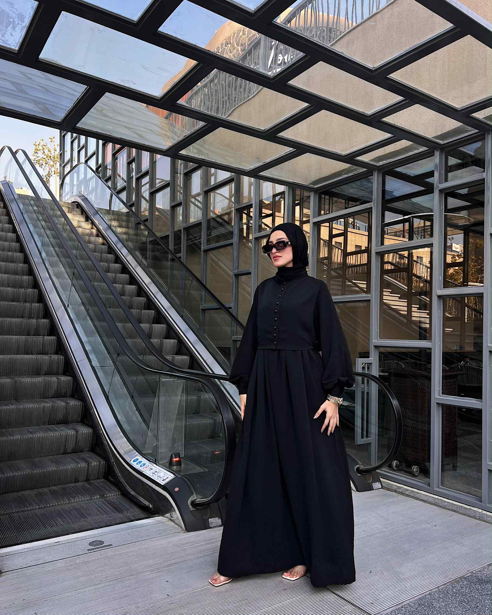An elegant set crafted from premium crepe fabric, featuring a flowing abaya paired with a chic sleeveless blouse (cut blouse).